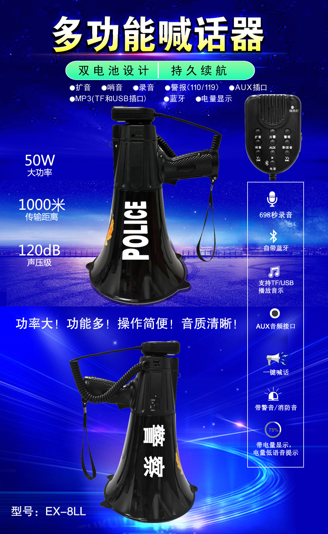 • 專業(yè)設計,外觀獨特、新穎,操作簡便的多功能喊話器